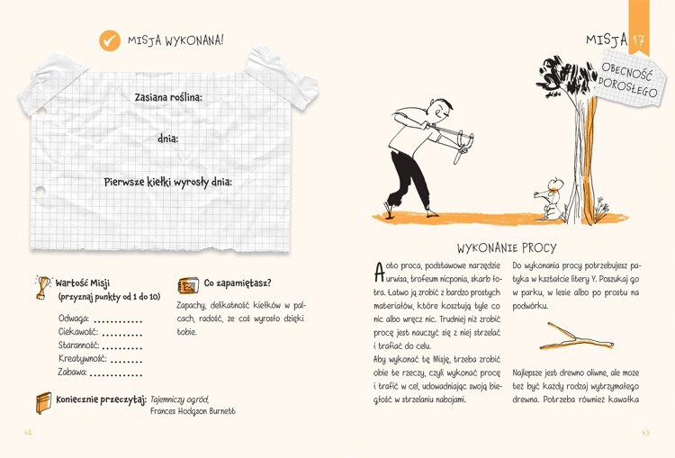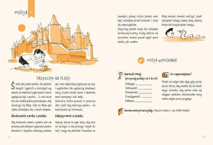 Marzysz o wielkich odkryciach i fantastycznych przygodach, ale nie wiesz, jak zacząć? Pomoże ci ten niezwykły przewodnik w formie notesu, w którym znajdziesz aż 50 misji do wykonania przed ukończeniem 13 lat. Myślisz, że potrafisz zbudować domek na drzewie? Zrobić gigantyczną bańkę mydlaną? A czy uda ci się nakarmić siedem różnych gatunków zwierząt?