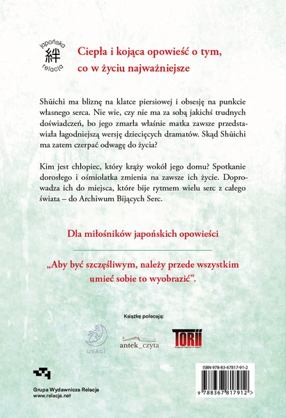 Wyspa bijących serc autorstwa włoskiej pisarki Laury Imai Messina wydanej przez Grupę Wydawniczą Relacja #współpracabarterowa "Aby być szczęśliwym, należy przede wszystkim umieć to sobie wyobrazić" Wyspa bijących serc to ciekawa pozycja literatury pięknej, niekoniecznie azjatyckiej, ale na pewno autorka zna realia, kulturę i zwyczaje. Książka, która na pierwszy rzut oka ma nam dać melancholijny spokojny vibe, jak wiele z podobnych książek chociażby od Kawaguchiego. Już nie ma prostoty w opowiadaniu przedstawionej historii, a wykwintny piękny język z wieloma metaforami i podejściem, z którego Sokrates byłby dumny. To ciężka w odbiorze książka wymagająca dużego skupienia i połapania się w historii pełnej retrospekcji, wtrąceń i cytatów. Mnie to momentami męczyło mimo, że sama historia urzeka swym pięknem bawiąc się naszymi neuronami. Łatwo byłoby się odbić od tej książki przez przedstawioną formę. Dla ludzi bardziej logicznych, którym metafory i domyślanie się pewnych kwestii jest niezbyt po drodze może być to naprawdę trudna pozycja. Ale warto gdzieś tam na po nią sięgnąć, bo w wielu kwestiach może zainspirować, zmotywować, wywołać uczucie nadziei oraz zrozumienia w wielu aspektach życia. Trudne dzieciństwo, problem poradzenia sobie ze stratą bliskich, skomplikowane relacje małżeńskie, overthinking, problemy obsesyjnych myśli o własnym zdrowiu i wiele innych kwestii, z którymi każdy musi lub będzie musiał sobie prędzej czy później poradzić. Ja przyznam, że chyba nie do końca wyłapałem przekaz tej książki i nie wiem co finalnie o niej myśleć. Dlatego dla mnie nie był to do końca relaks, a proces myślowy odnalezienia sensu i przesłania. Twórczość Messiny bardziej przypomina doświadczenie, niż zwykłą książkę. Ja ją na pewno zapamiętam i może wrócę na innym etapie mojego życia by zobaczyć efekty wewnętrznej zmiany. Jestem ciekawy, czym wtedy będzie dla mnie Wyspa bijących serc.