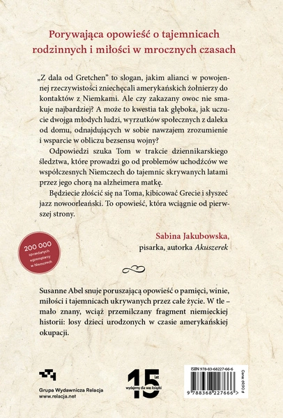 W porywającej i zaskakującej historii Susanne Abel porusza przemilczany temat losów dzieci urodzonych w czasie amerykańskiej okupacji Niemiec.