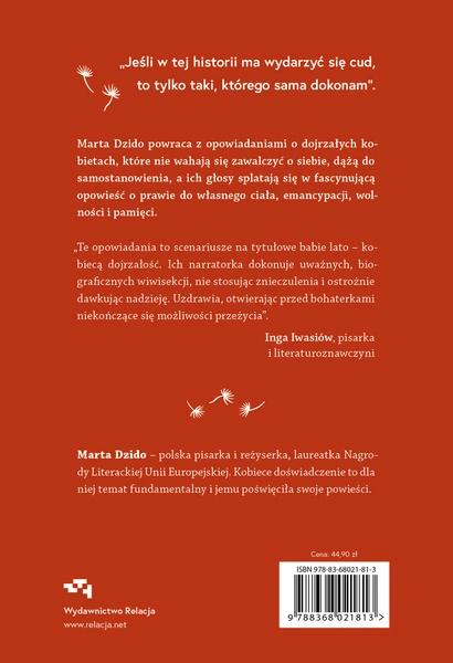 • "Babie lato" Marty Dzido to zbiór opowiadań o kobietach nie bojących się zawalczyć o siebie. Autorka ukazuje afirmację cielesności oraz życiowe blizny, które nas kształtują. Opowieści te splatają się w narrację o wolności, emancypacji i odwadze.