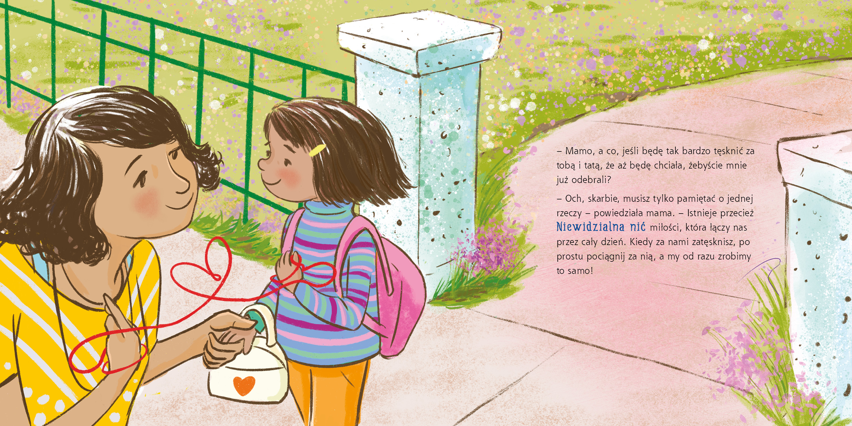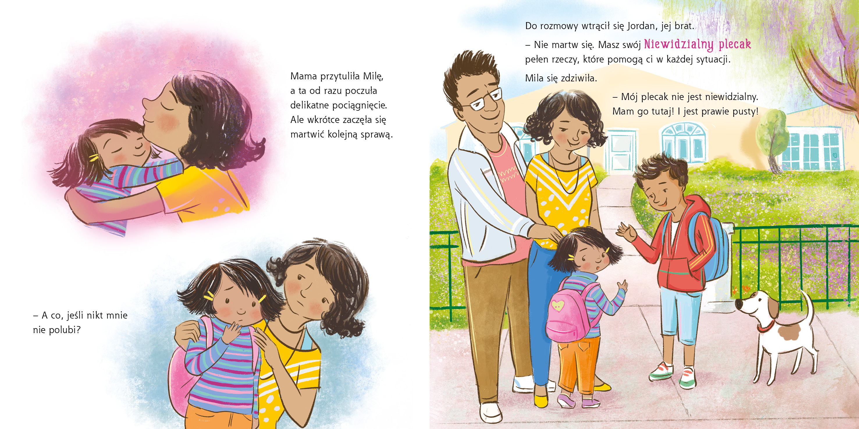 W pierwszym dniu szkoły Mila czuje niepokój. Co jeśli się zgubi? Co jeśli nikt jej nie polubi? Dzięki mądrej radzie starszego brata odkrywa, że wszystko, czego potrzebuje, ma zawsze przy sobie – w swoim Niewidzialnym Plecaku. Niewidzialny mikrofon dodaje jej odwagi, latarka rozjaśnia niepewność, a niewidzialna sieć pomaga w razie upadku. A wszystko zaczyna się od jednej rzeczy – Niewidzialnej Nici, która łączy ją z bliskimi i daje poczucie bezpieczeństwa.