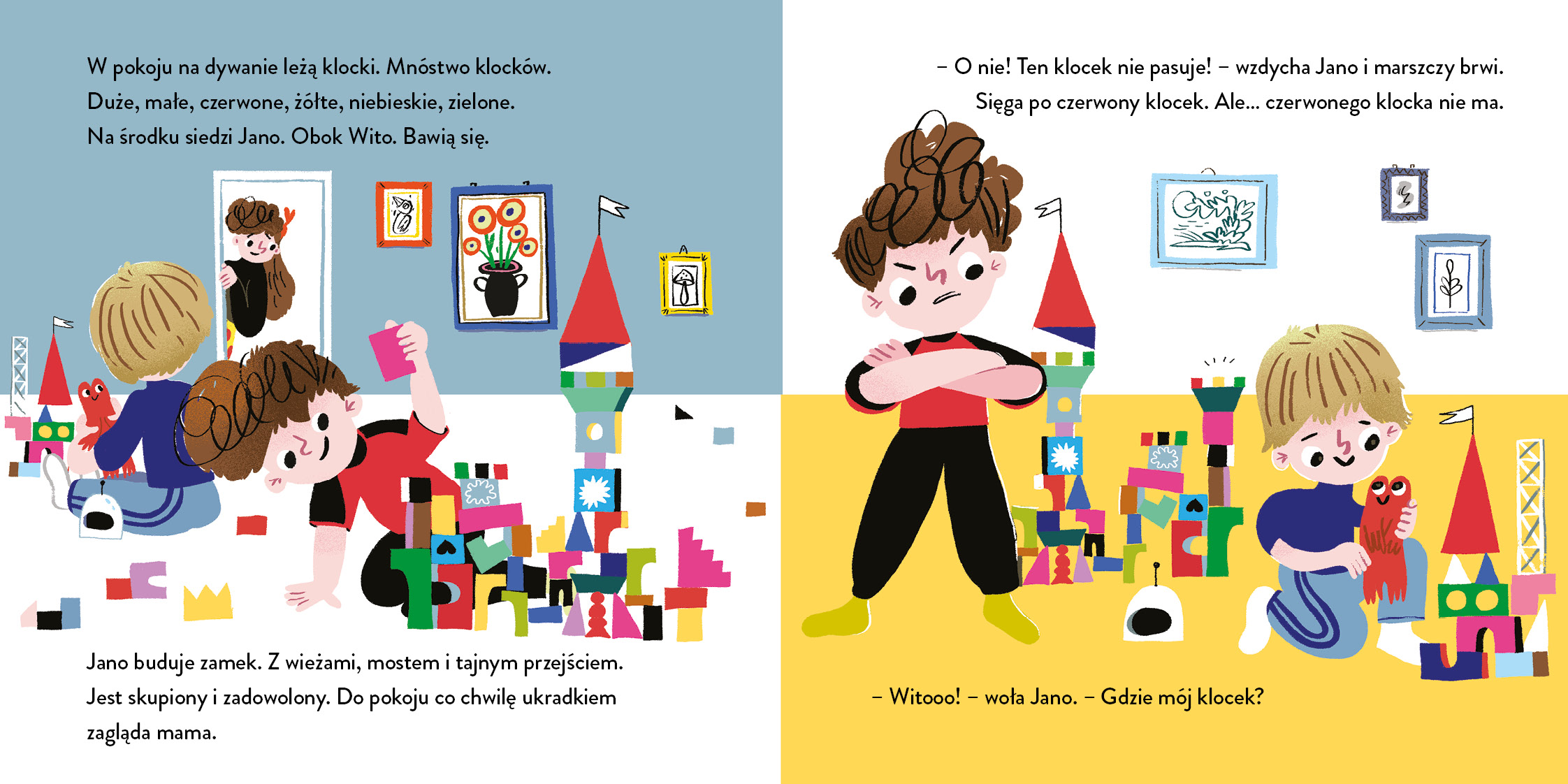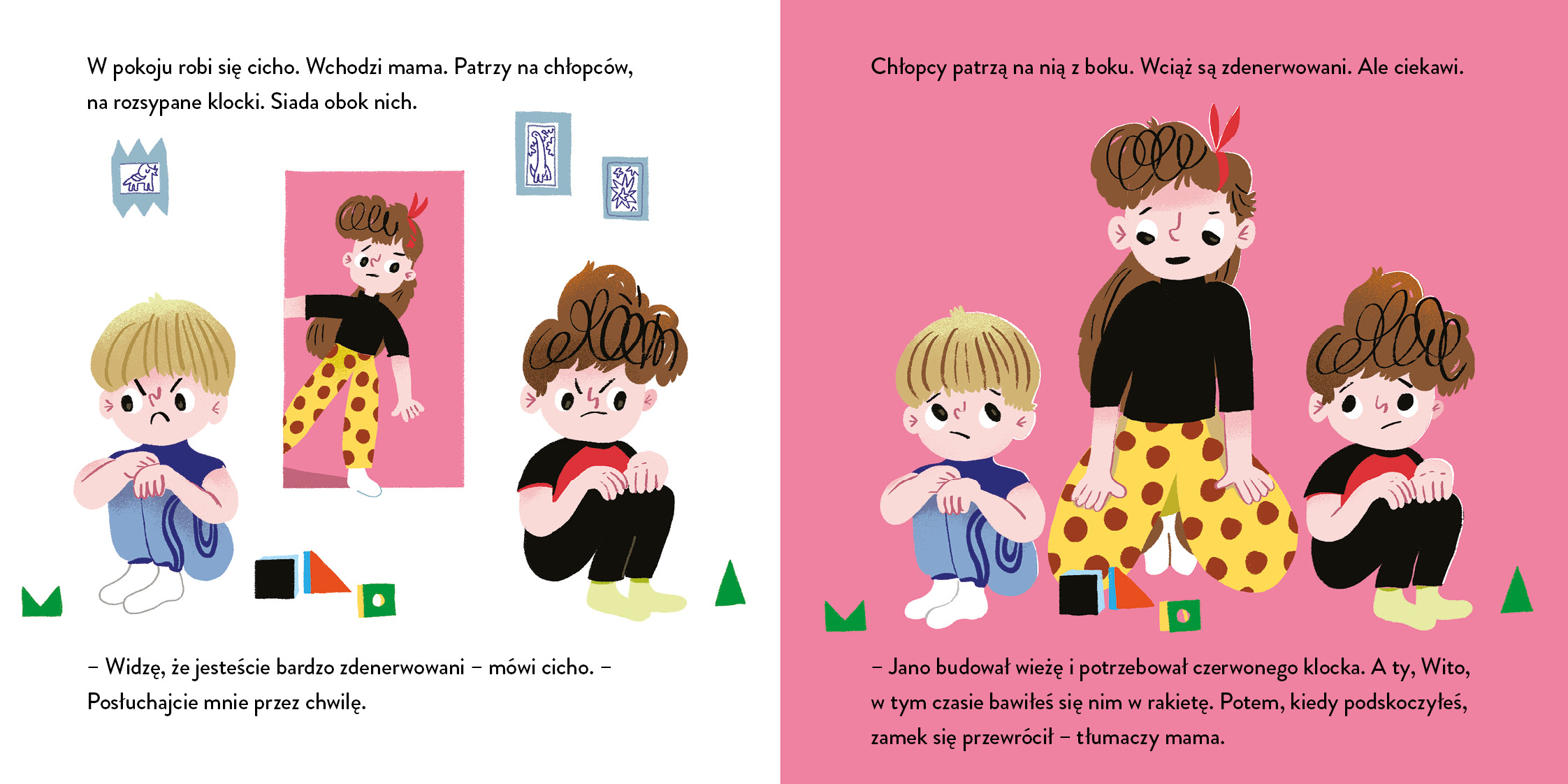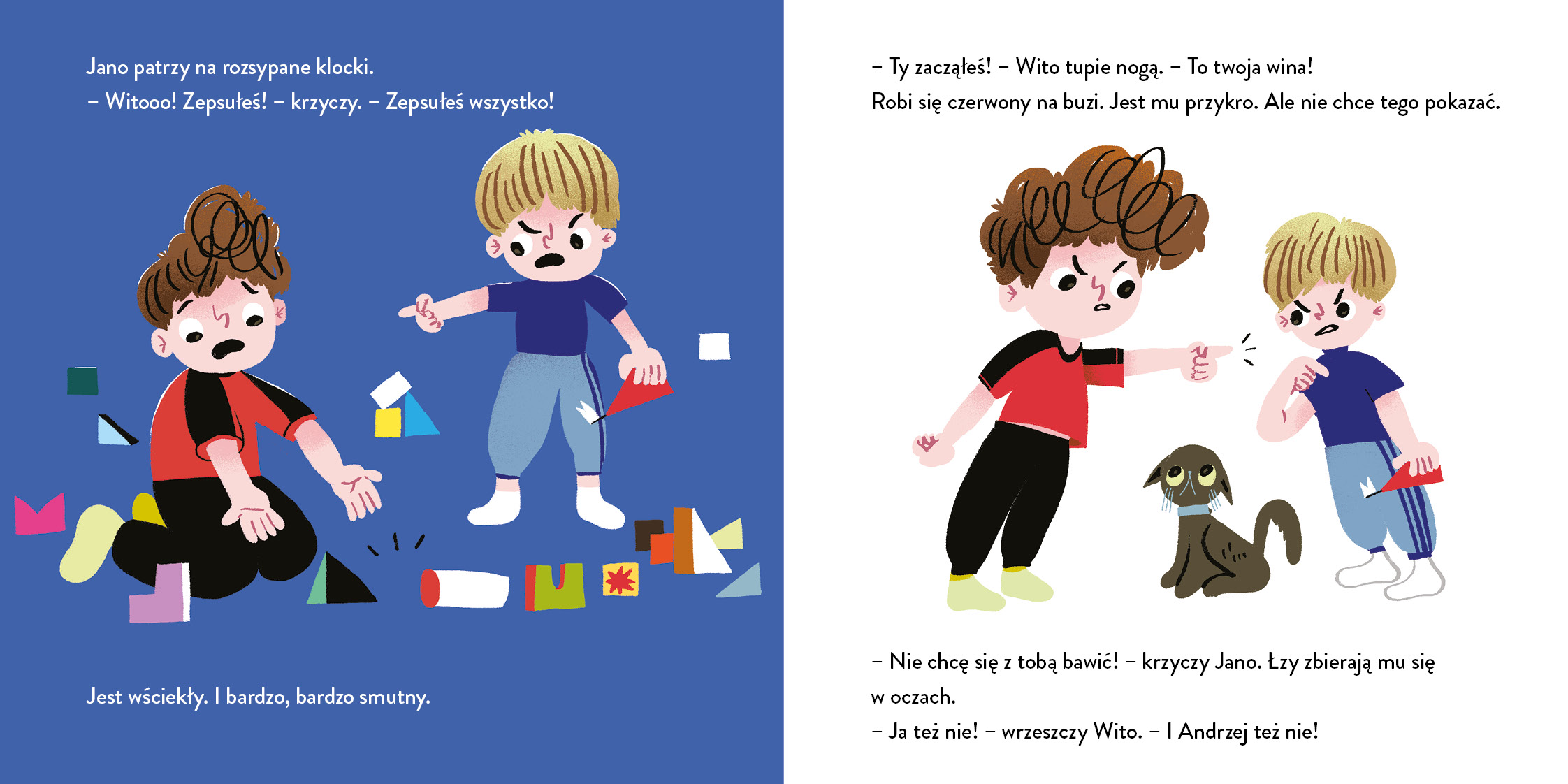 Jano i Wito bawią się klockami. Ale jak to często bywa, trudno jest im się dogadać – pojawia się złość, krzyk i... kłótnia. Co zrobić z trudnymi emocjami? Jak pogodzić różne pomysły na zabawę? Mama wie, jak rozwiązać spór i pomóc swoim dzieciom dojść do porozumienia!