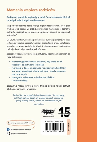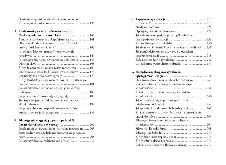 Dr Laura Markham, psycholożka kliniczna i doktor na Uniwersytecie Columbia, autorka przełomowej książki Pokojowy rodzic, szczęśliwe dzieci, przedstawia proste i skuteczne sposoby na przezwyciężenie kłótni i pielęgnowanie wspierającej, pełnej miłości więzi między rodzeństwem.