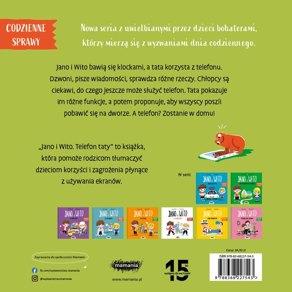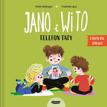 Jano i Wito bawią się klockami, a tata korzysta z telefonu. Dzwoni, pisze wiadomości, sprawdza różne rzeczy. Chłopcy są ciekawi, do czego jeszcze może służyć telefon. Tata pokazuje im różne funkcje, a potem przypomina, że telefon to tylko narzędzie, a najlepsza zabawa czeka w prawdziwym świecie. Proponuje, aby wszyscy poszli pobawić się na dworze! A telefon? Zostanie w domu!