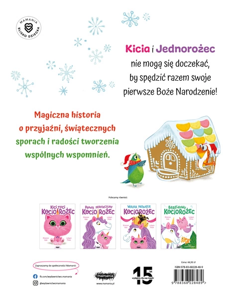 • Kicia i Jednorożec wracają w magicznej historii o przyjaźni, świątecznych kłótniach i radości tworzenia wspólnych wspomnień – idealna książka do czytania pod kocem w blasku lampek choinkowych!
