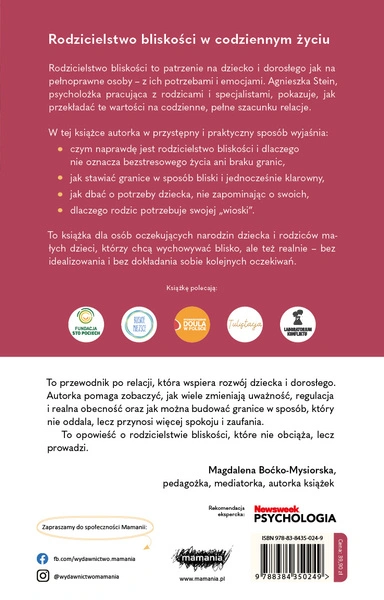- Praktyczny przewodnik po rodzicielstwie bliskości. Agnieszka Stein wskazuje, jak zadbać o potrzeby dziecka i całej rodziny, bez nadmiernych oczekiwań i presji. Kolejna książka z eksperckiej serii „Mamania. Pierwszy kontakt”.