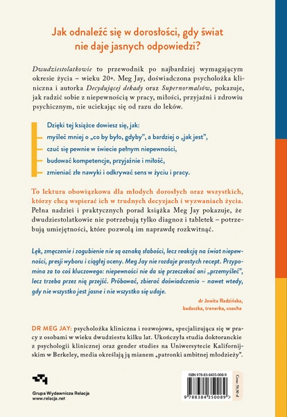 Meg Jay, psycholożka pracująca na co dzień z osobami w wieku 20+, pokazuje, że większość tych trudności nie jest zaburzeniem, lecz naturalnym elementem wchodzenia w dorosłość. Zamiast proponować „pigułkę na całe zło”, zachęca do rozwijania konkretnych kompetencji, które realnie wzmacniają psychikę i pomagają ruszyć naprzód: budowania zdrowych relacji, świadomego kształtowania kariery, rozwijania odporności psychicznej, poszerzania perspektyw i korzystania z pojawiających się szans.