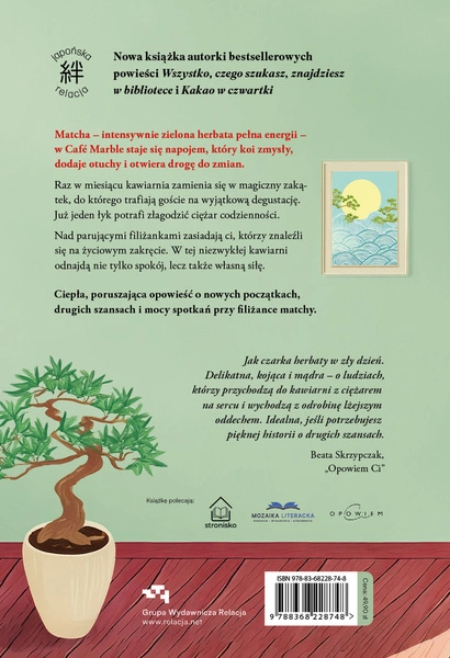 - 12 miesięcy, 12 historii, a wszystko zaczyna się od filiżanki aromatycznej matchy. Królowa japońskich comfort books, zabiera czytelników w pełną ukojenia podróż przez codzienne radości, drobne smutki i magiczne momenty, które czynią życie piękniejszym.