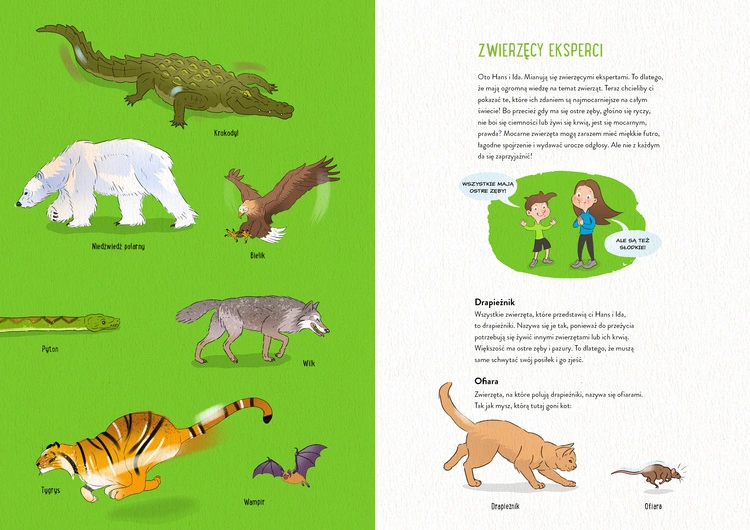 Mocarne zwierzęta poważnie traktują małych miłośników zdobywania wiedzy. Siedmiu przedstawicieli drapieżników prezentuje swoje niezwykłe umiejętności. Niedźwiedź polarny, wilk, krokodyl, tajemniczy nietoperz, pyton, orzeł i tygrys zapraszają do swojego sekretnego świata. Zobaczysz, że mogą też mieć miękką sierść, łagodne oczy i wydawać słodkie dźwięki. Ale nie wszystkie nadają się do przytulania!