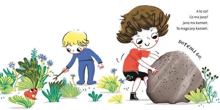 Duży Jano i mały Wito znajdują tajemniczy kamień. Co się stanie, kiedy go dotkną? Ojej, to magiczny kamień! Teraz wszystko zrobiło się taaakie duuuże – wąż jest ogromny, wielka pszczoła robi bzzz, bzzz i można się nawet wspinać na zająca!